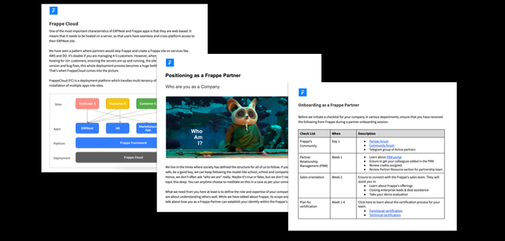 Based on its own real-world experience of delivering ERPNext services, Frappe has drafted the Standard Operating Procedures (SOP). The SOP is intended to act as a bible for the existing partners as well as those who are getting newly onboarded. It covers a wide range of topics ranging from key facets of the ecosystem to best practices/guidelines about core pillars of the business. The SOP gets revamped to its next version periodically after more relevant content is generated.