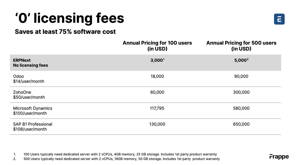 At Frappe, we take immense pride in our 100% open source products — ERPNext, being open source, has a ‘0‘ licensing cost, and we only charge for product warranty through Frappe Cloud (Users can also opt to host on any other public server if they want to). Switching to ERPNext can help companies reduce their software spending by at least 75%. Check out this comparison table, which charts a clear picture of how teams can save their investments and upgrade to superior-quality software.