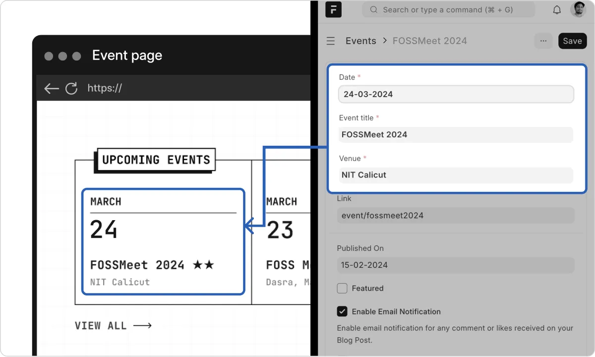 Static content is only a small fraction of any website. Most websites have sections that represent dynamic objects, like blog articles, product pages, lists that are generated dynamically from your data. Builder is powered by Frappe Framework which is a full-stack low-code framework that helps you store and manage your data. Builder can generate blocks directly from the backend and show them.