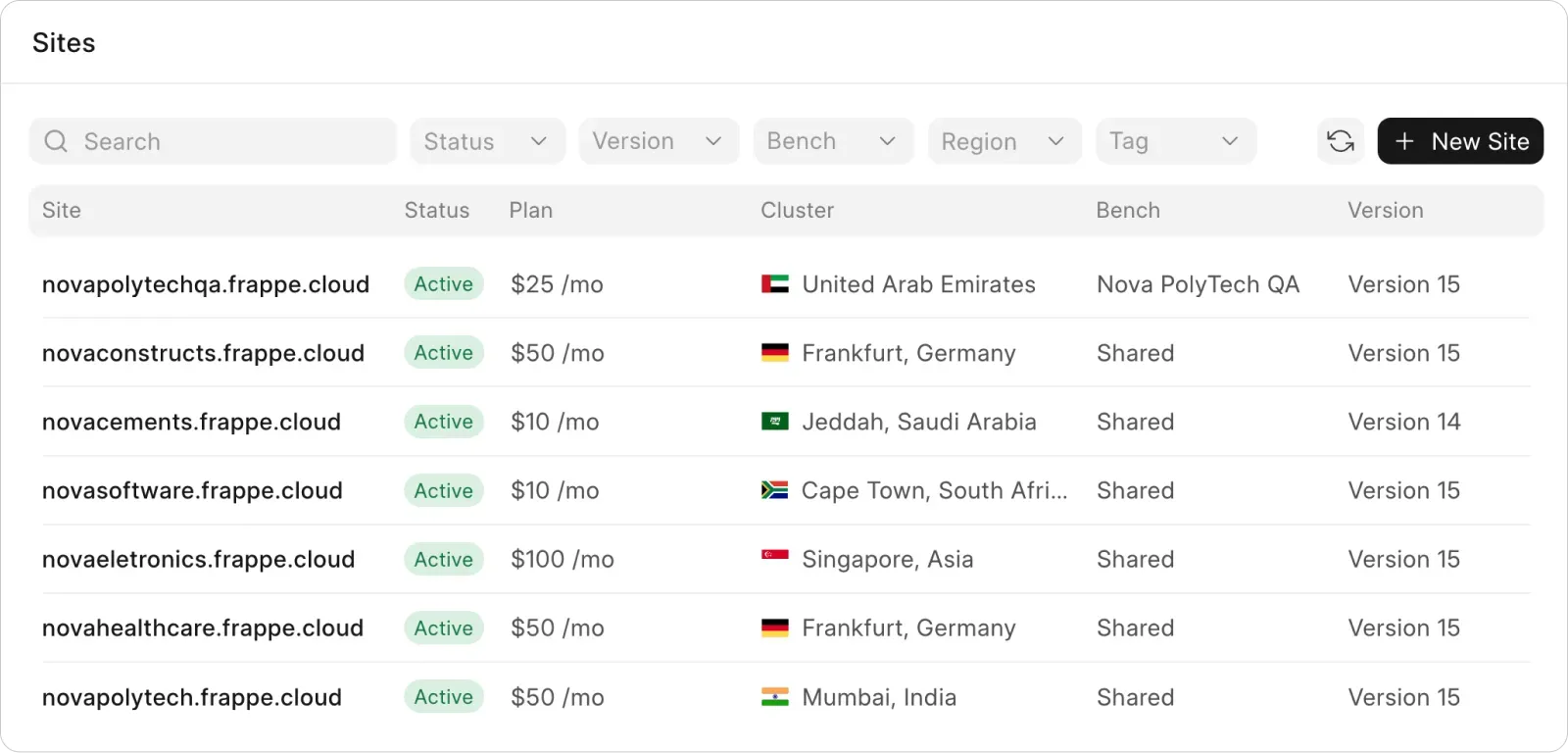 Frappe Cloud dashboard helps you manage multiple tenants with a simple and user-friendly dashboard. You can easily manage multiple sites, benches and servers across multiple regions. You can onboard as many domains as you need and trust them to be secure with free provisioned SSL certificates.