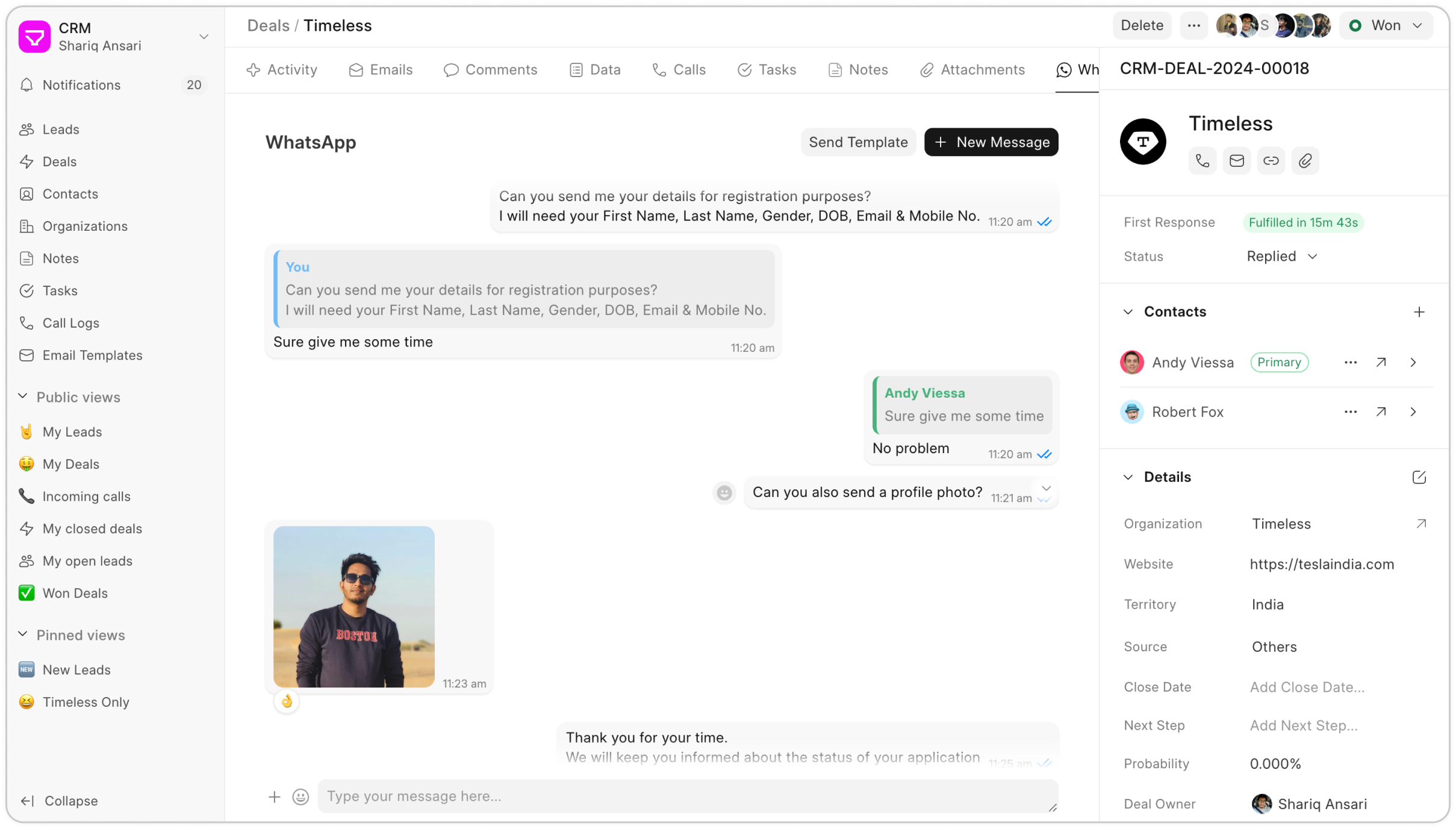 Not every conversation starts with an email. A quick WhatsApp message can move a deal forward just as easily. With Frappe CRM, you can send and receive WhatsApp messages from the lead or deal page, keeping every exchange linked. That way, you don’t have to search through old chats or wonder what was last discussed.