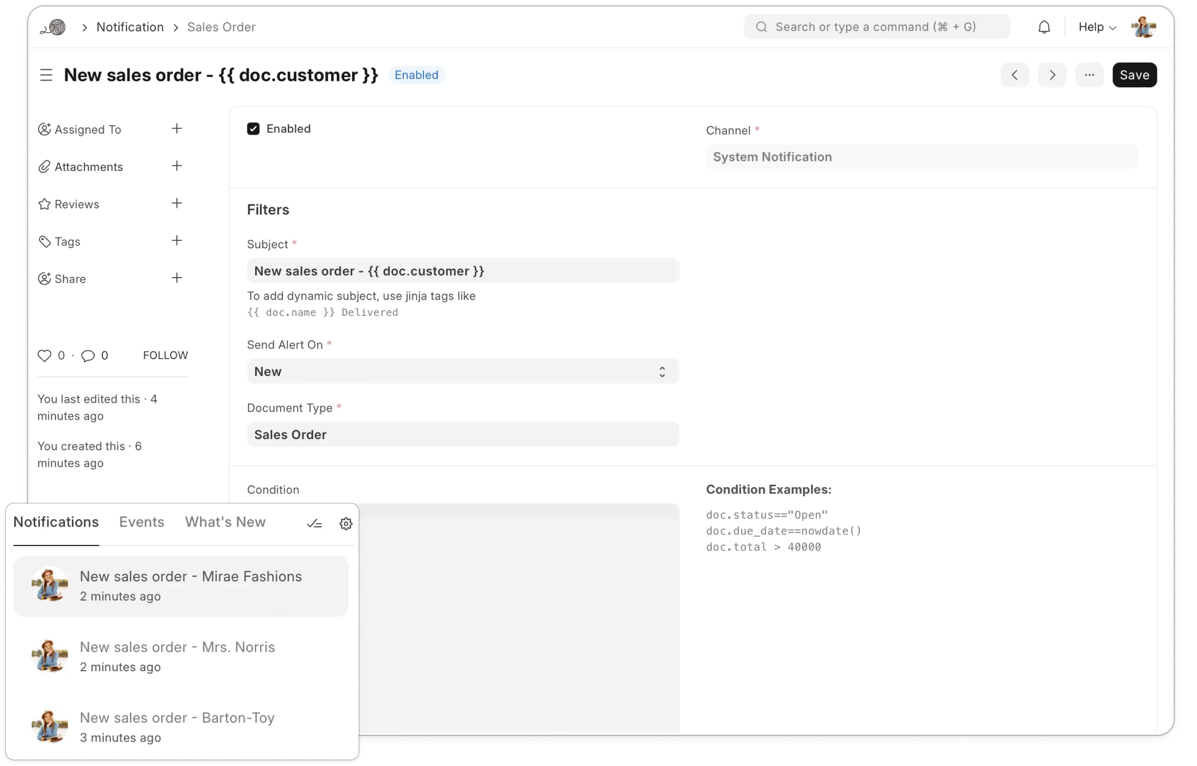 Create in-app / email / whatsapp / slack notifications on the fly. So if you’re a CXO, get important reports mailed to you on a set frequency. Or if you’re an HR, set up an email notification when someone requests for a leave. If you’re a salesman set up a slack notification every time a new lead is created in the CRM. These are just a few examples. Use your imagination and set up notifications to save time and become more efficient.