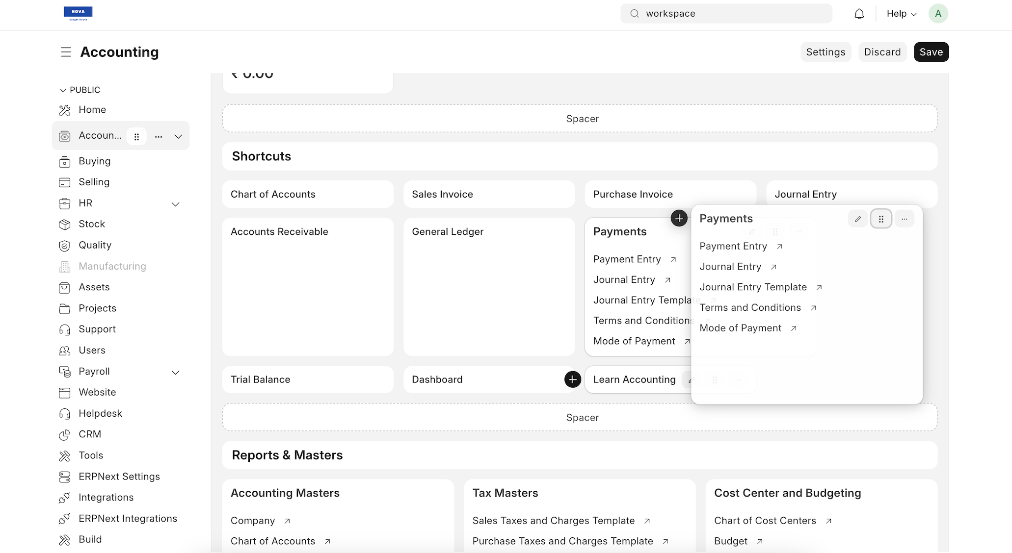 When you log into your Framework app, the first thing you see is the workspace. The default workspace helps you navigate your system, but you can customize it to organize and access your most-used DocTypes, reports, and key charts. This way, you can monitor everything that matters at a glance.