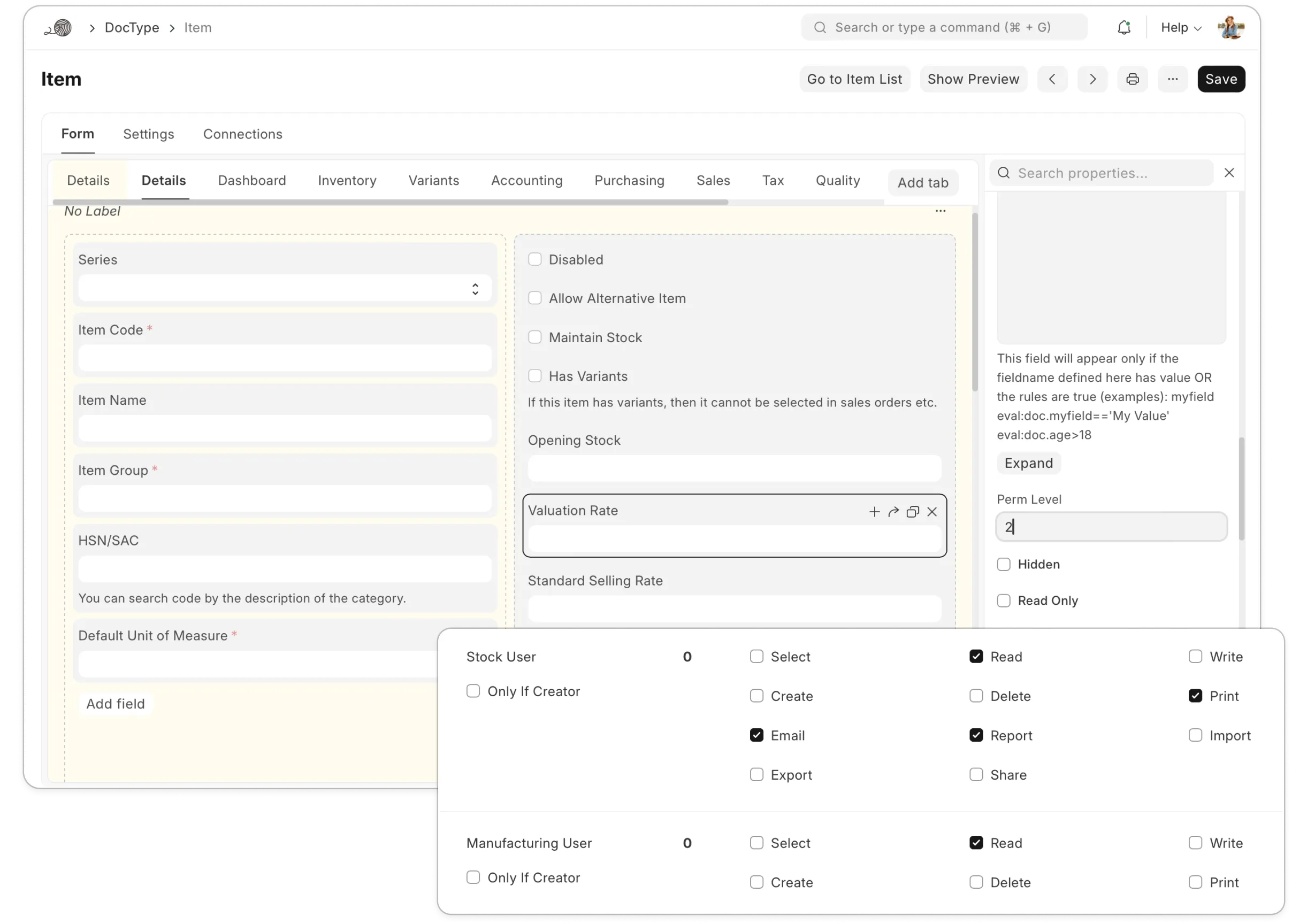 The extensibility and flexibility of ERPNext is unrivaled. Every custom field you create becomes instantly available as an API point in the powerful interface of the ERP software.