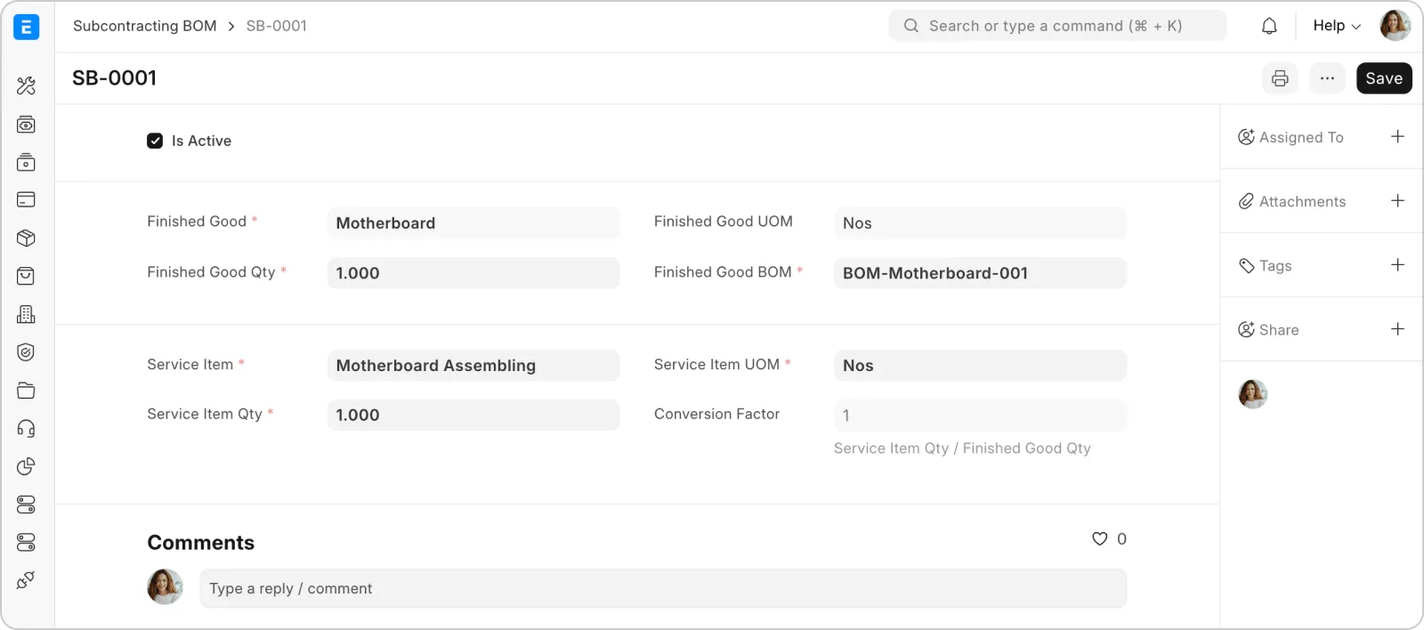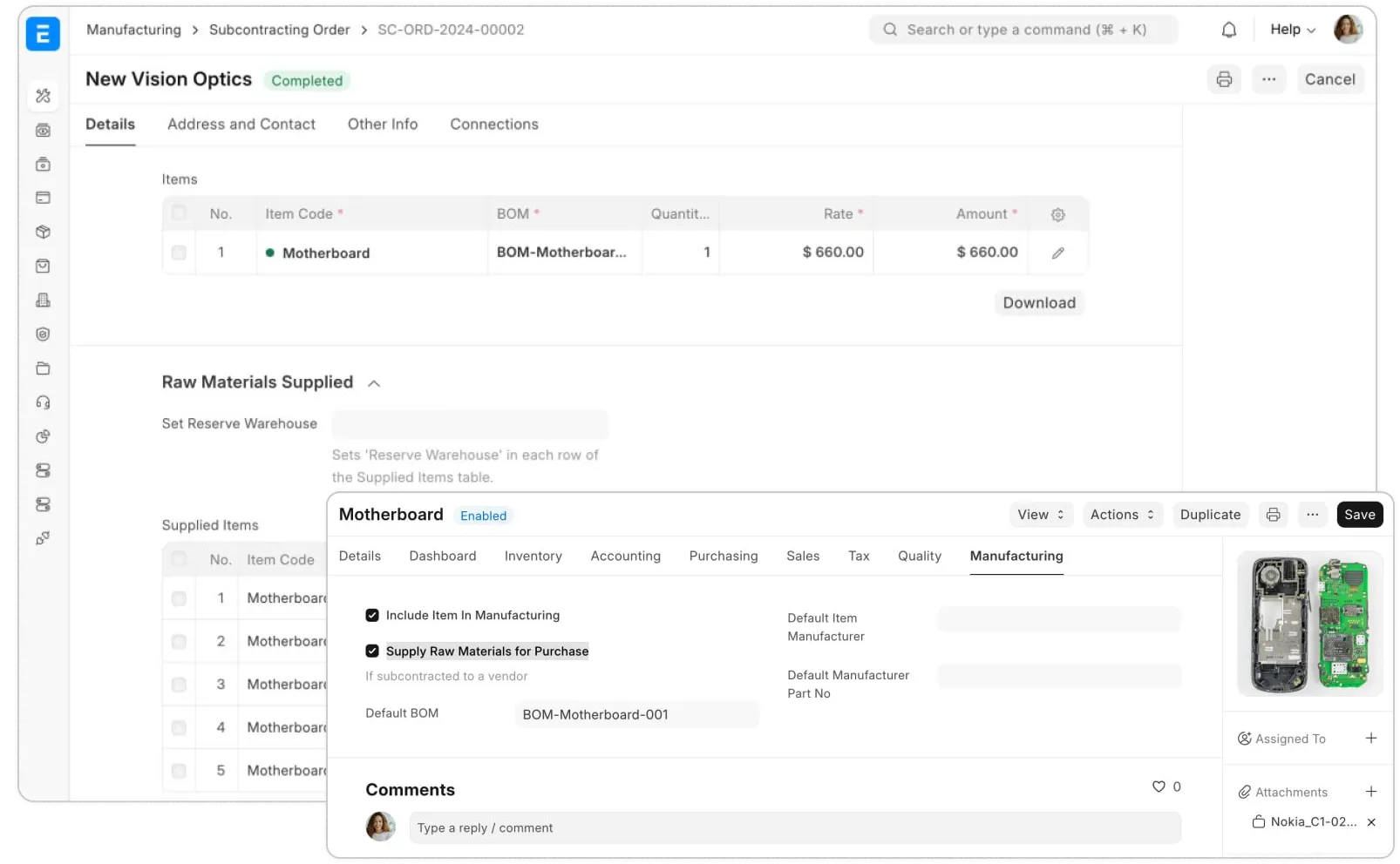 Even when subcontracting, discipline and precise tracking are crucial to ensure quality and accuracy. In ERPNext, you can flag each subcontracted item and link it directly to a detailed Bill of Materials (BOM). This provides a clear list of materials to supply to the subcontractor, reducing logistical challenges and ensuring smooth operations.