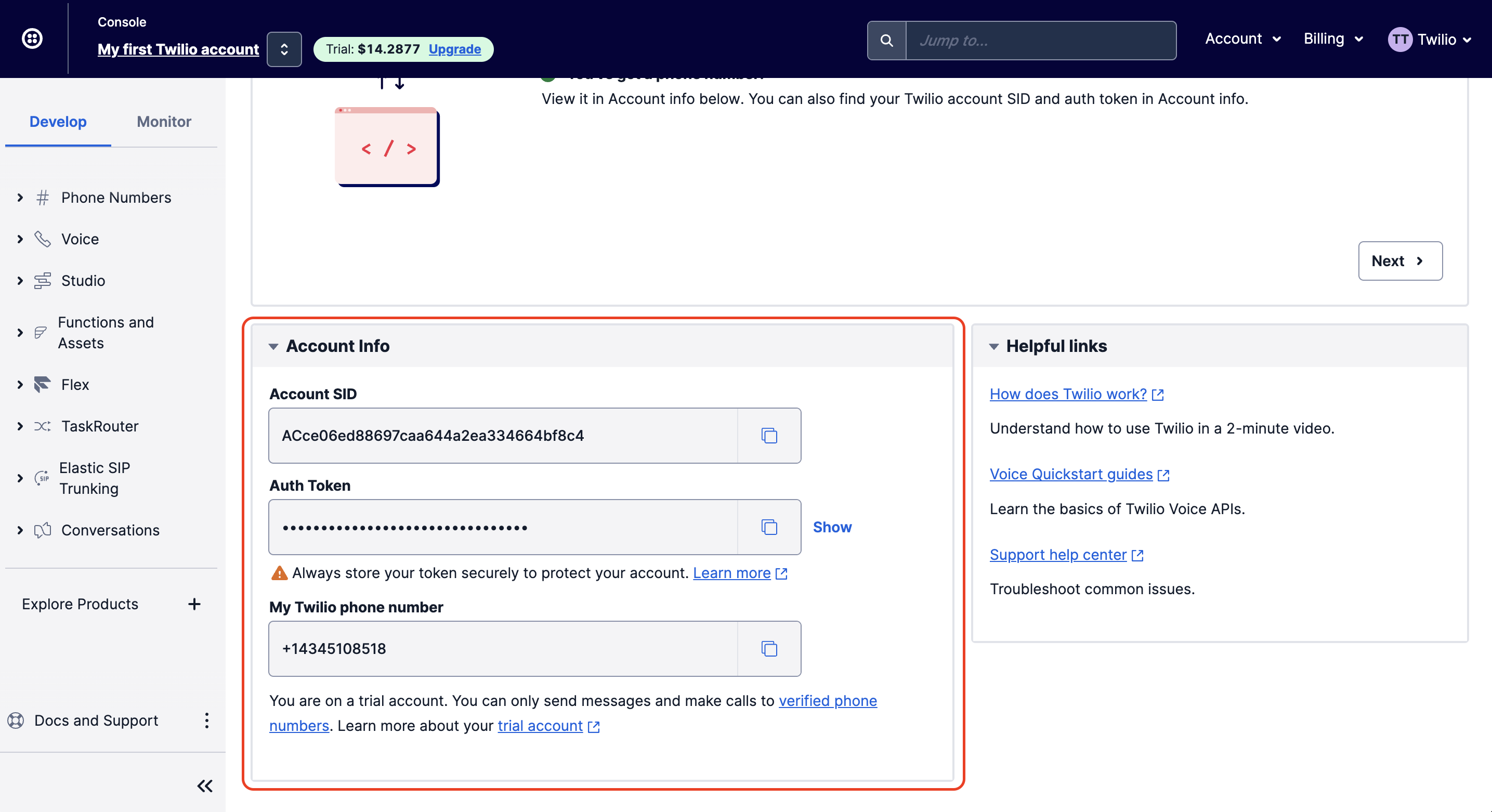 You can obtain your Twilio Credentials from the 'Account Info' section of your Twilio dashboard. Take note of your 'Account SID' and 'Auth Token' which will be used in further steps.
