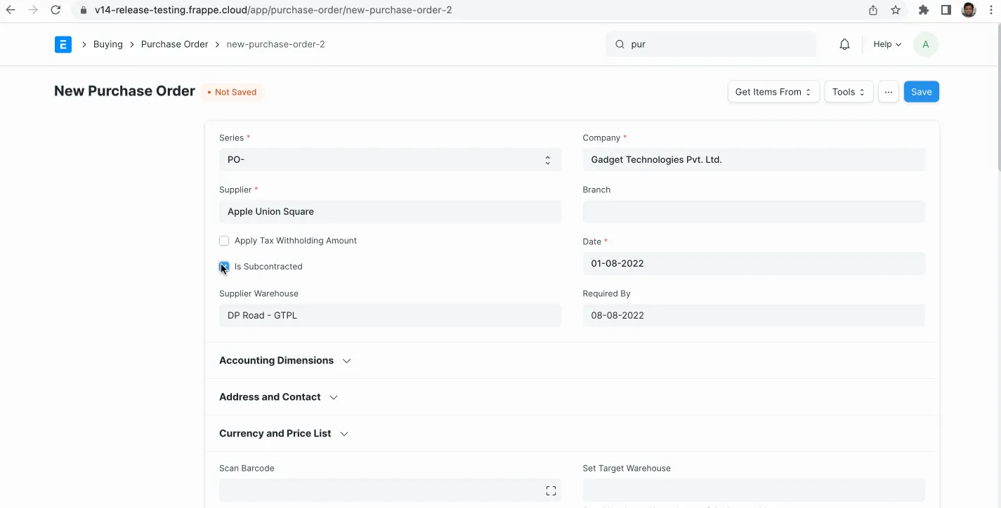 Manage your subcontracting orders using the new and dedicated Subcontracting Order and Subcontracting Receipt documents.