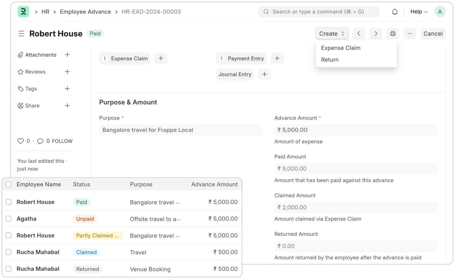 When employees incur expenses on behalf of their company, they either spend it from their own pocket or use prepaid advances and claim later. Frappe HR takes care of auto-allocating unclaimed amounts from multiple advances against your expenses to eliminate the need for separate reconciliation.