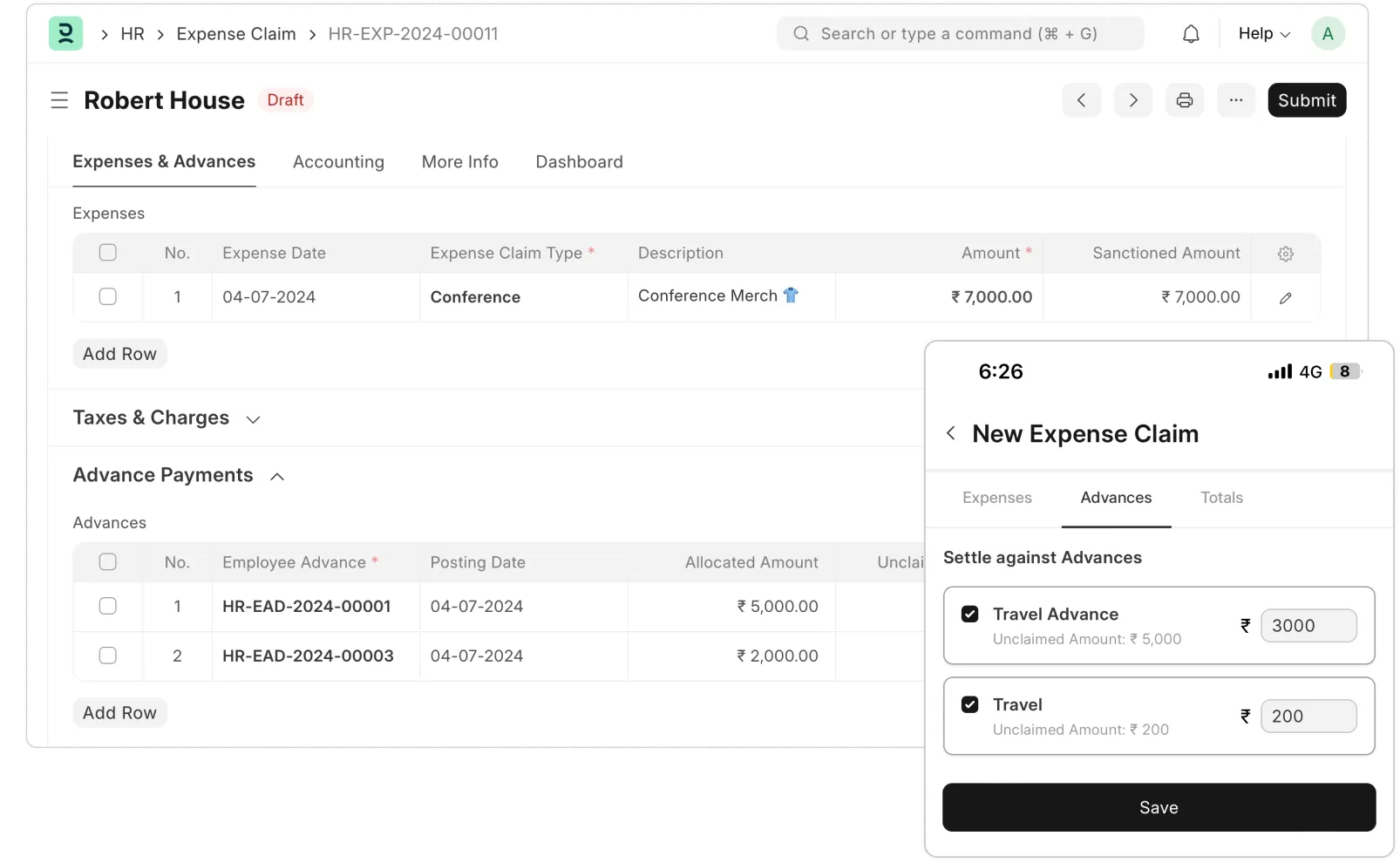 You can also manage partial payments against claims and advances and track employee payables and receivables for a complete financial picture.
