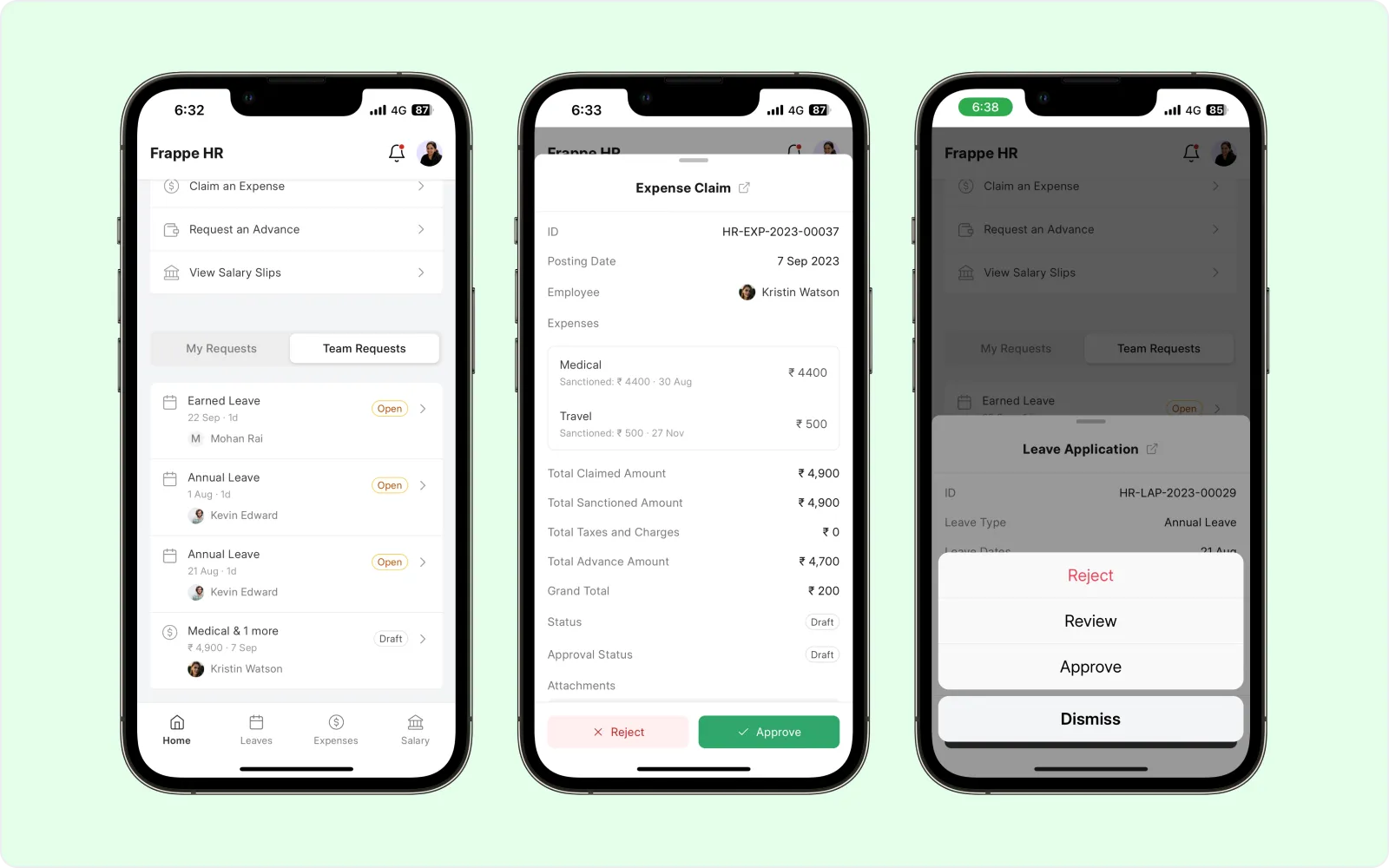 The Frappe HR Mobile App brings everyday tasks to your fingertips — employee check-ins, leaves, claims, advances, and salary slips. The goal of this app is not just to ease operations for your employees but also to improve efficiency for your HR Managers. Track all the requests that need your attention on the go based on the employee's approver/workflows.