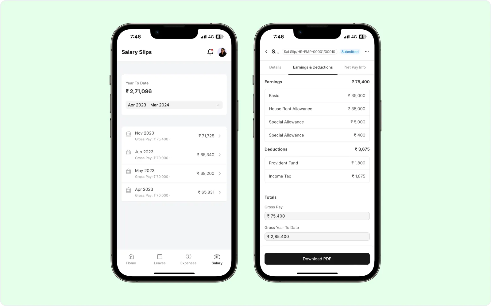 In the Salary dashboard you can see a list of salary slips and your year-to-date payouts filtered by payroll period. Check and download salary slips for offline access