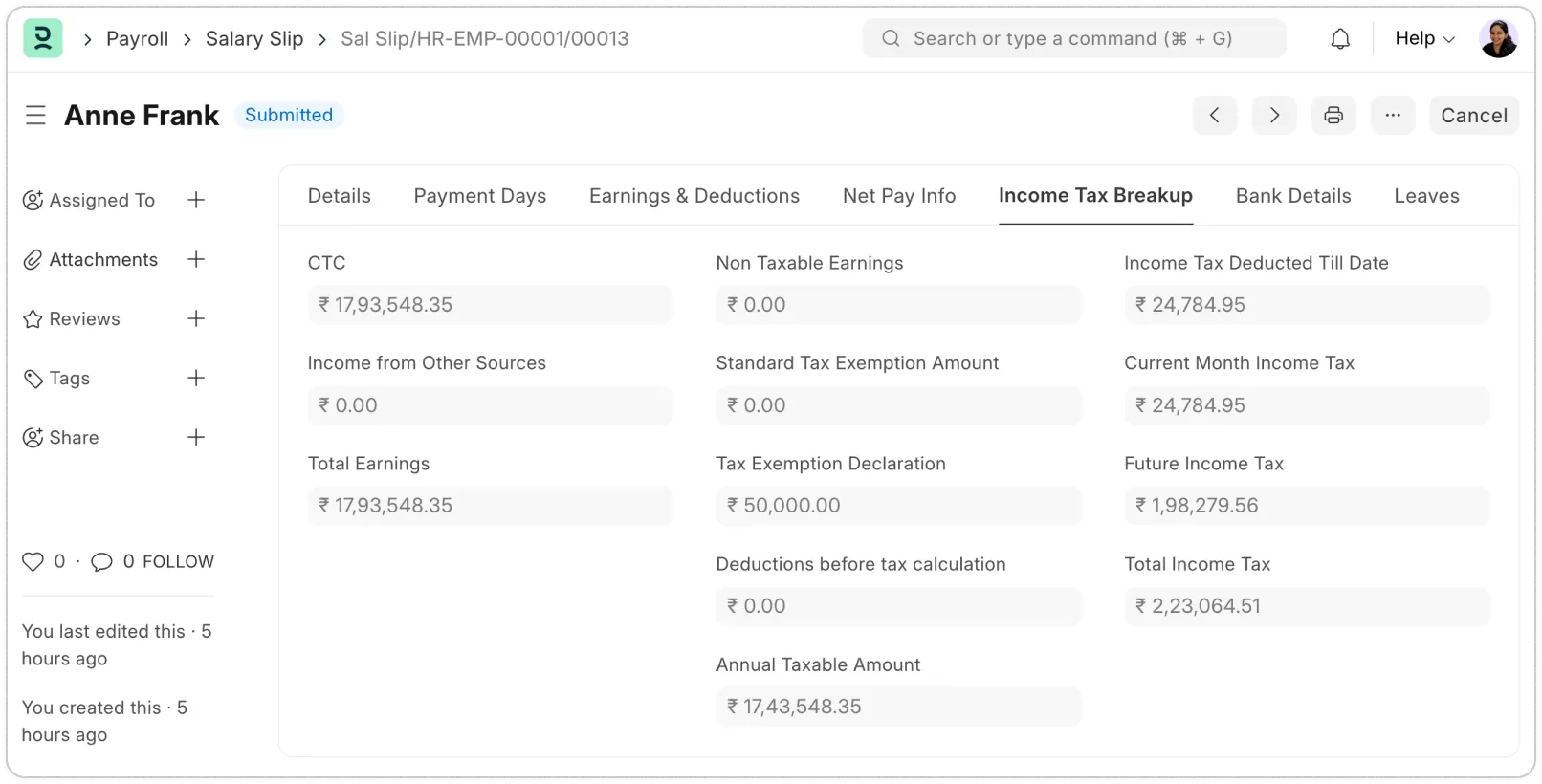 Have you ever struggled with understanding how the tax amount was derived on your Salary Slip? A salary slip generated in Frappe HR gives you a complete overview of your tax calculations - CTC, exemptions, declarations, non-taxable earnings, annual taxable amount, income tax deducted to date, and future deductions.