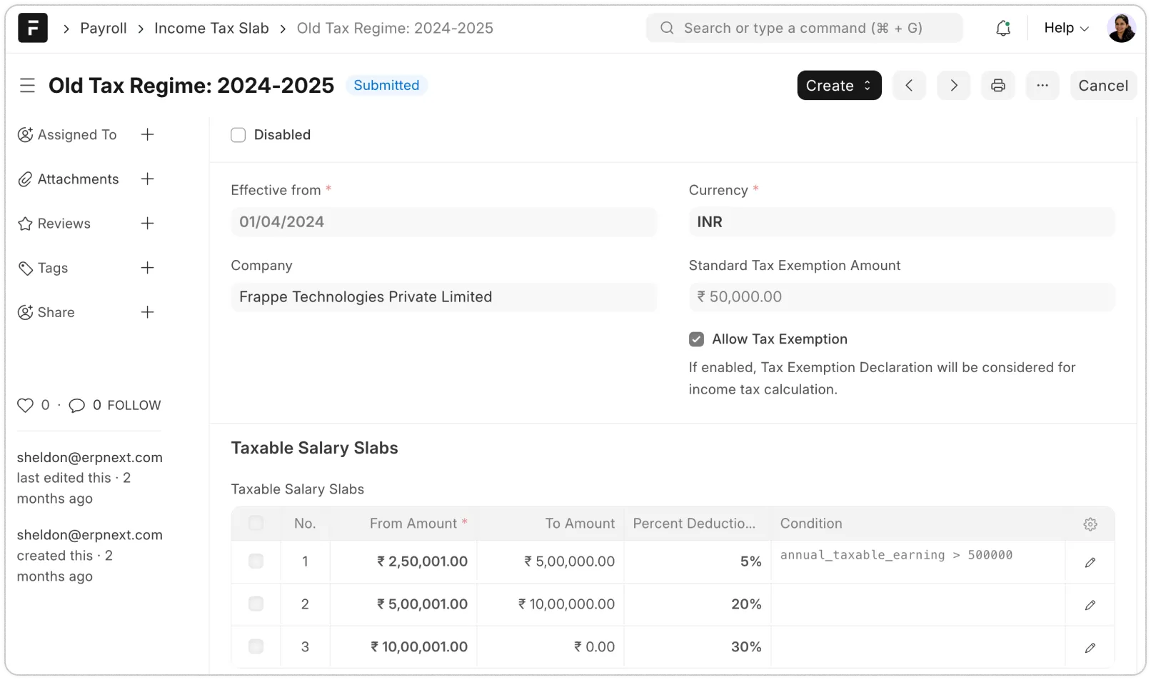 Frappe HR lets you configure multiple income tax slabs with rates and conditions. Link the employee’s preferred tax regime in their salary structure assignment. Easily factor in additional taxes like Health and Educational Cess on top of the income tax calculations. You can also define the minimum and maximum taxable amount for which this tax would be applicable.