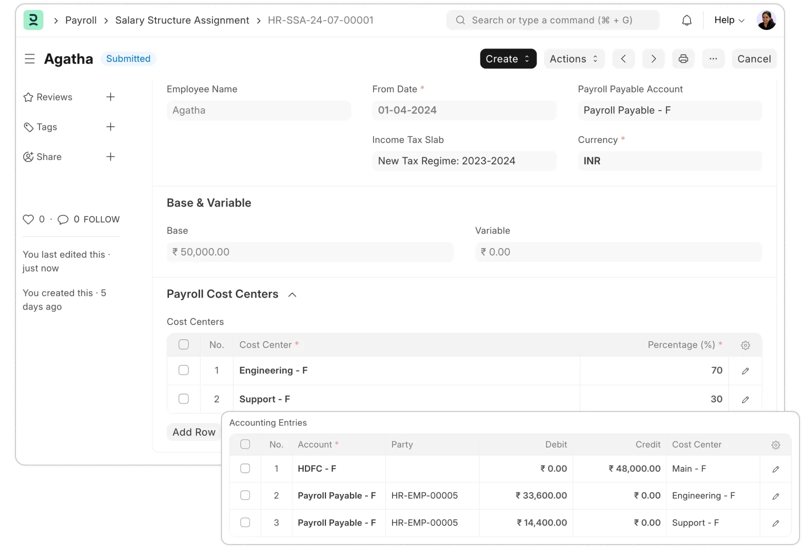 As your employees grow in their careers, they might contribute actively to more than 1 business unit. In that case, the salary expenses associated with that employee can be distributed against multiple cost centers by configuring this breakup in salary structure assignments.
