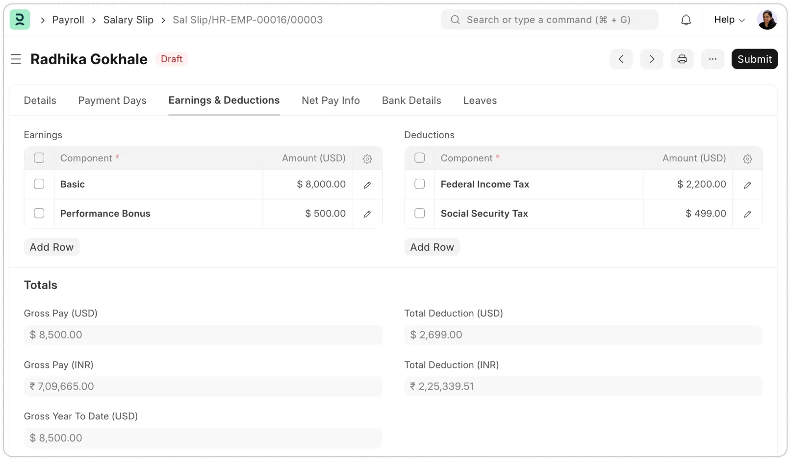 Frappe HR empowers you to build rule-based, complex salary structures easily. Define earning and deduction components with conditions and formulas. Map any payroll use case - from statutory & tax deductions to bonuses and allowances.