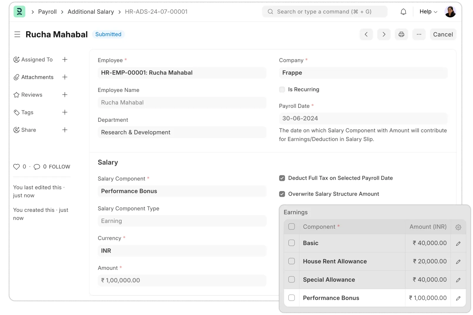 Manage ad hoc salary components without revising your salary structure every time. The additional salary feature in Frappe HR helps you easily set up one-time or recurring payments or deductions. These could be performance bonuses, deputation allowances, pay cuts, arrears, incentives, or any other type of adjustment. You can also specify whether tax needs to be deducted for this specific component during payroll.