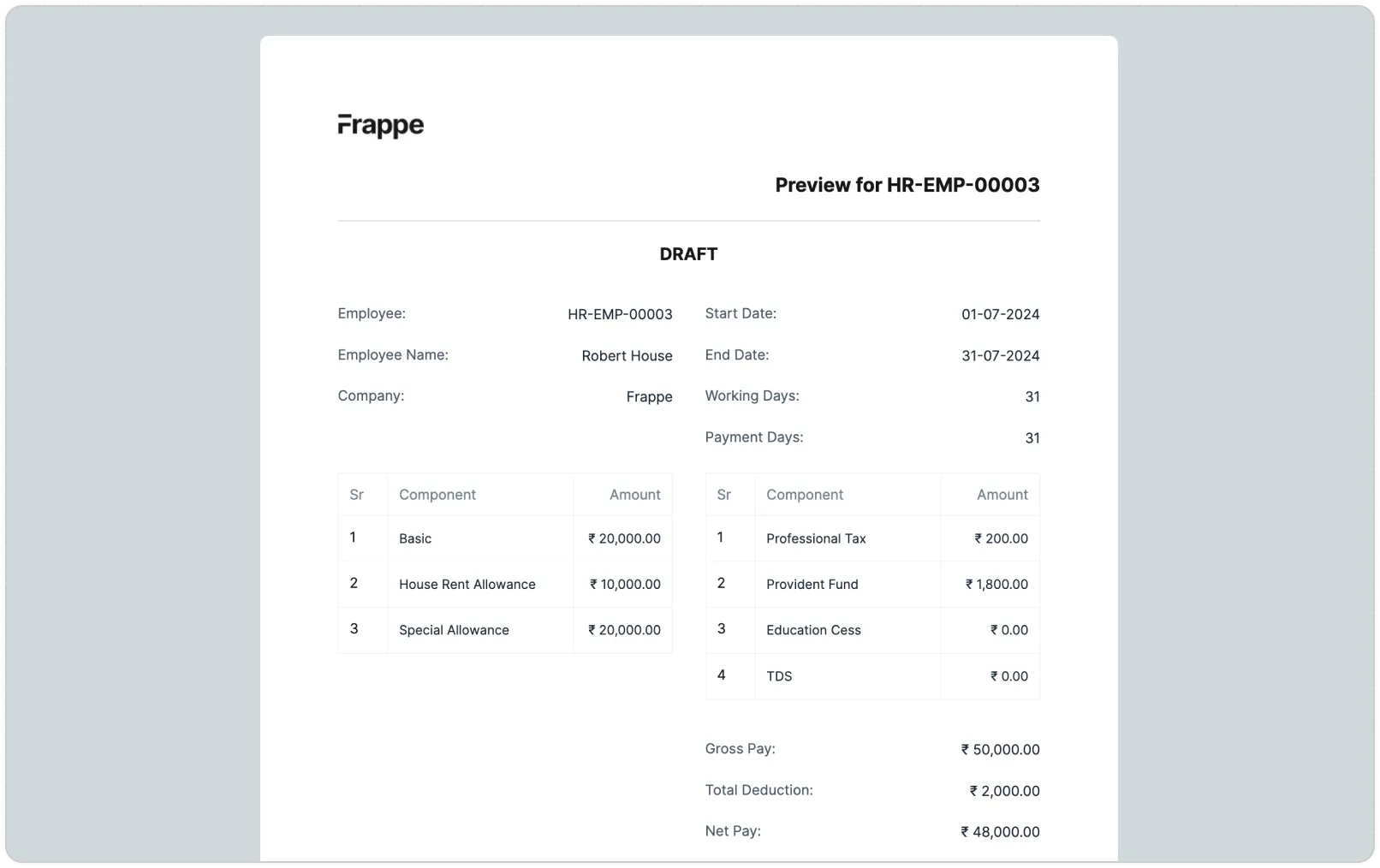 Want to ensure your salary structure configurations are correct? Frappe HR lets you preview salary slips to see the configurations taking effect. Make amends wherever needed before running the actual payroll.