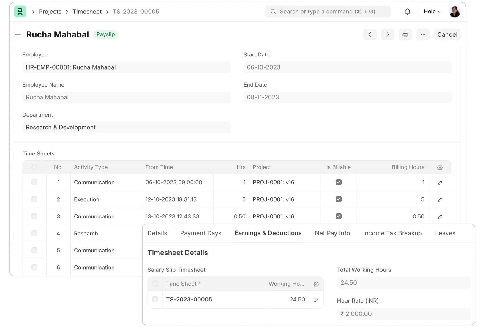 Employees who need to track their hours can easily fill out timesheets with a breakdown of activities for each project or task. Create salary structures based on timesheets, define hourly rates, and manage payouts for the timesheet hours. You can run separate payroll entries for timesheet-based salaries.