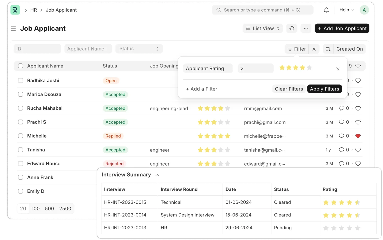 Efficiently capture feedback from multiple interviewers across multiple rounds. Frappe HR generates an overview of the average ratings, demonstrated skills, and a detailed feedback timeline, enabling you to make informed decisions.