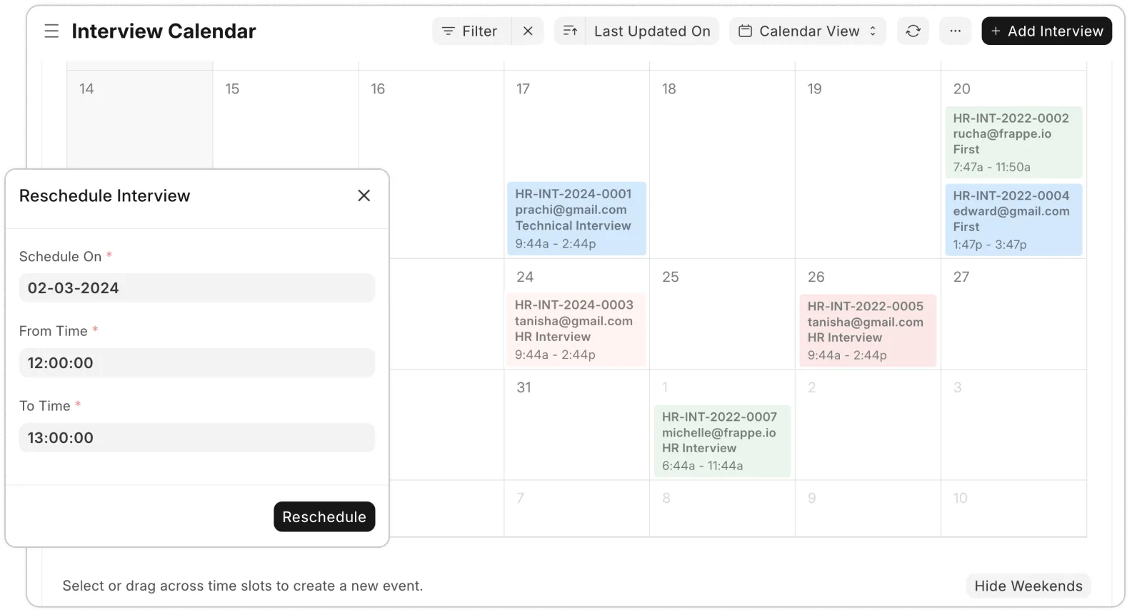 Schedule or reschedule interviews based on the recruiter's availability. Ensure that candidates and recruiters are informed at all stages through automated email reminders to avoid no-shows.