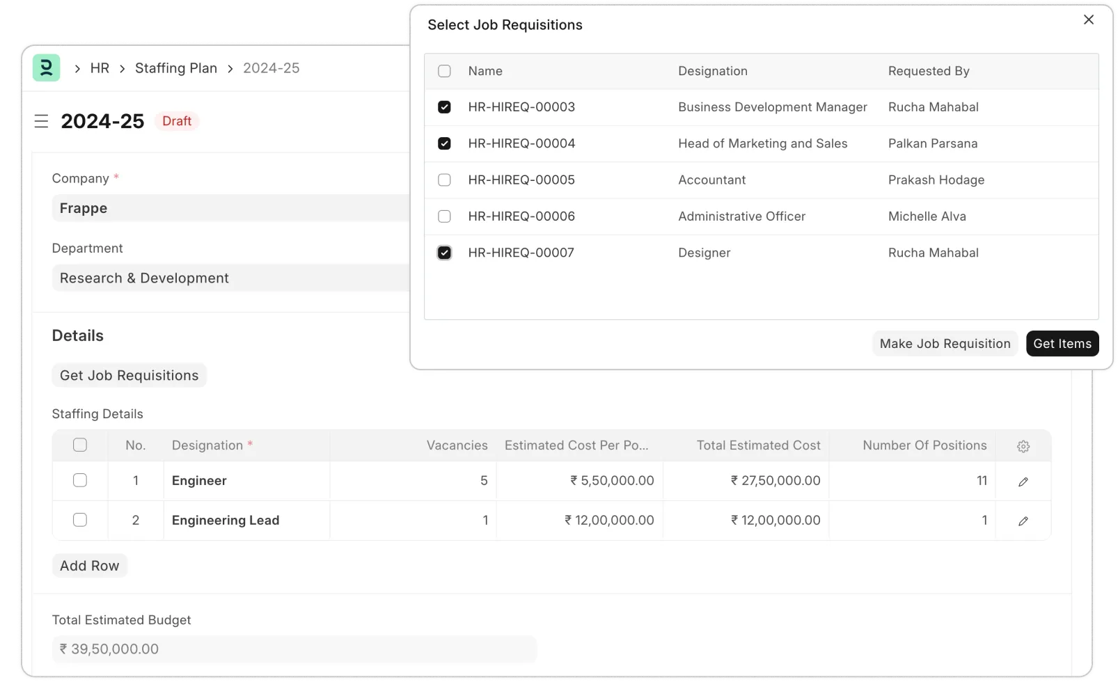 Create staffing plans at a company or department level by sourcing job requisitions. Define roles, the number of vacancies, and estimated costs while having the current headcount information handy to ensure you don’t go over budget.