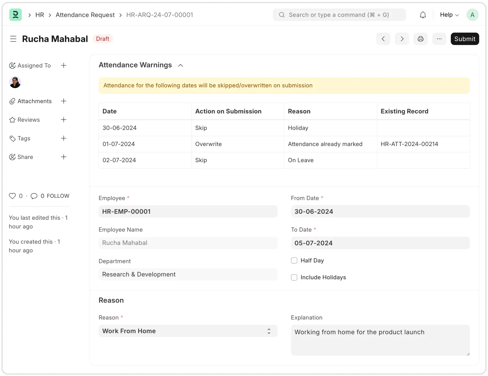 Missed a swipe? No sweat. Employees can easily submit attendance requests to rectify the attendance marked by the system.
