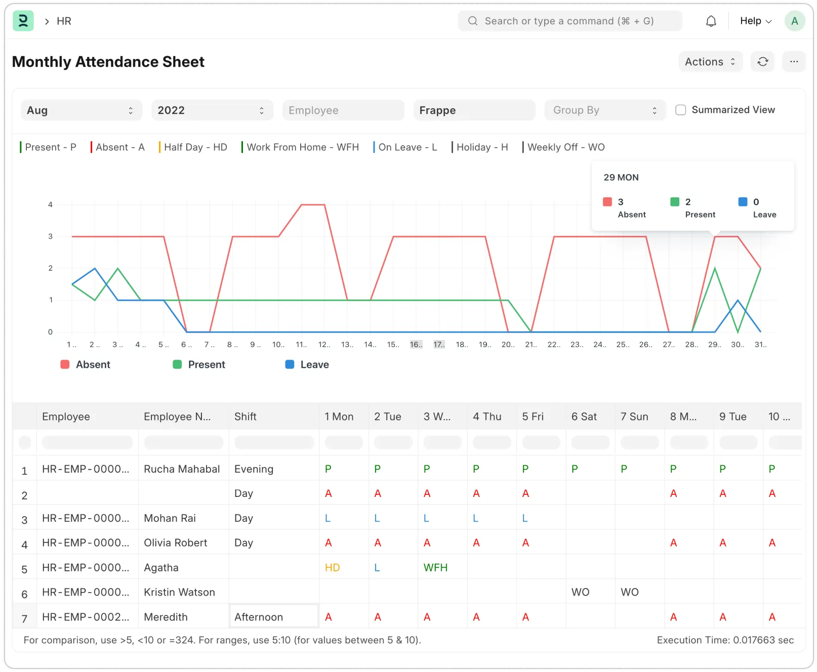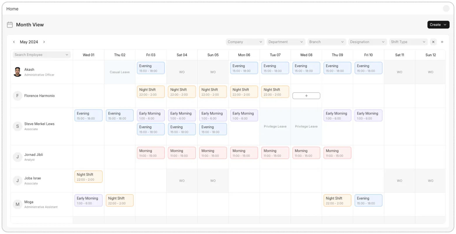 Missed an entry? Don’t worry. You can refer back to the monthly attendance sheet with drill-down filters to see day-wise attendance status per shift.