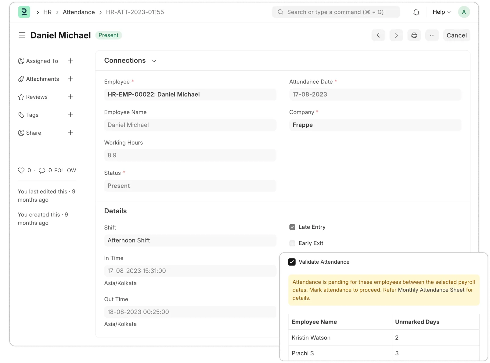 Frappe HR marks auto attendance based on your check-ins and shift settings. It also calculates working hours, and flags late entries & early exits based on your configuration. If you are using separate systems for attendance & payroll, Frappe HR can make your life easier. The attendance system is closely integrated with payroll to ensure accurate and timely payments.