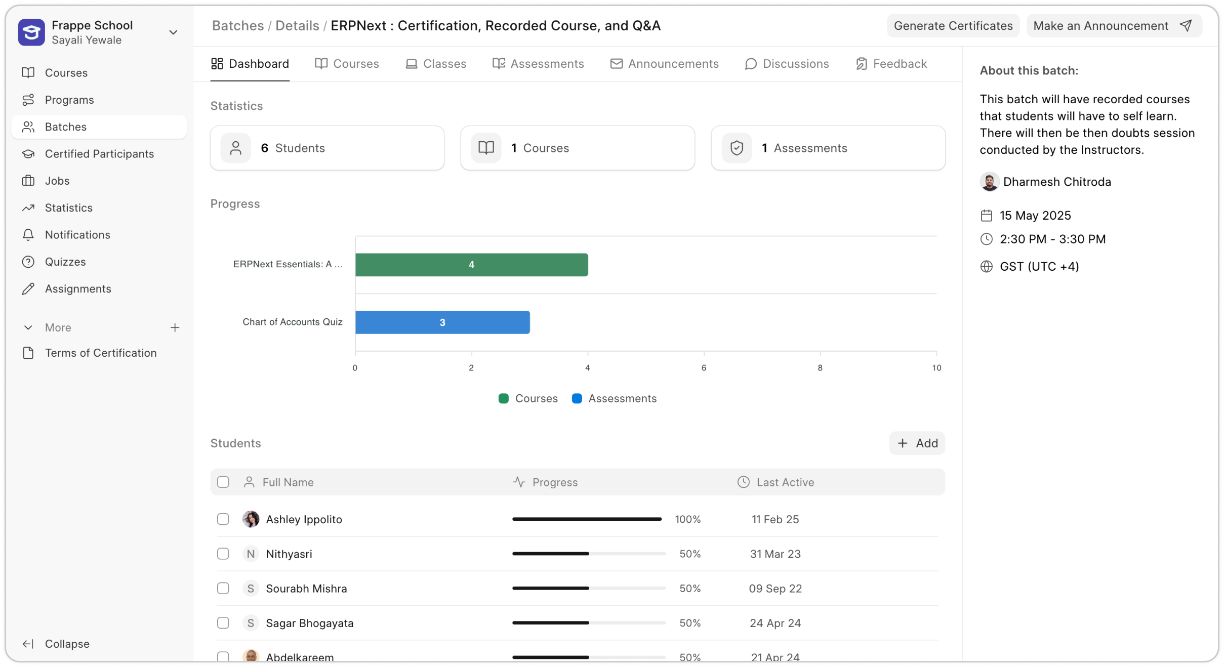 Quizzes make learning more engaging and help track progress. Instructors can create quizzes for both courses and batches with multiple-choice, short-answer, or open-ended questions. You can set time limits, passing percentages, and attempt restrictions. To keep things dynamic, shuffle mode randomizes questions, making each attempt unique.