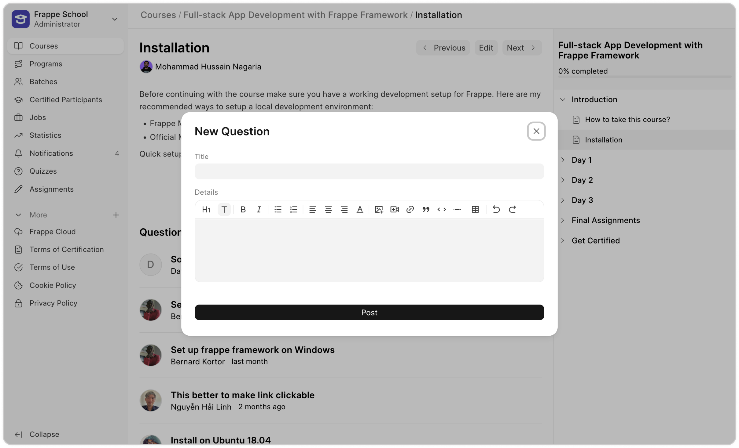 Imagine trying to learn from a mess of notes, videos, and files scattered everywhere—frustrating, right? Frappe Learning turns that chaos into a well-organized learning path. Think of your course like a book: chapters introduce the topics, and lessons explore the details. Lessons aren't just text; you can add videos, quizzes, and assignments to make learning fun and interesting. No more searching for materials or losing your place; everything is neatly arranged, guiding learners step by step.