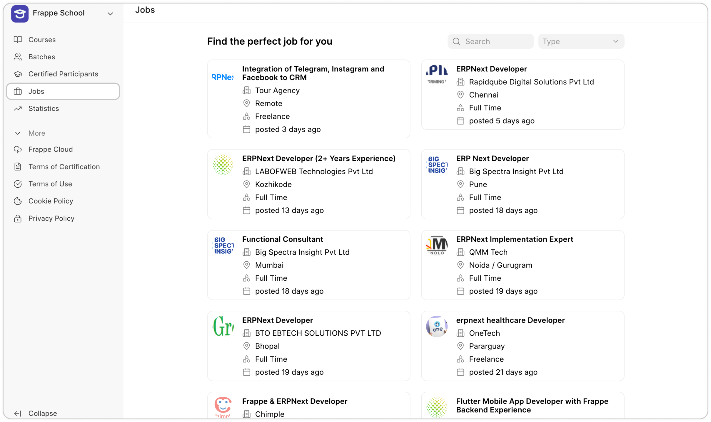 Learning shouldn't end with a certificate; it should open doors. Frappe Learning's integrated job board connects your learners directly with relevant opportunities. Students can discover jobs and internships that match their completed courses and certifications, while employers gain access to a pool of qualified candidates with proven skills. It's the perfect bridge between education and career advancement, helping your learners turn their new knowledge into real-world success.