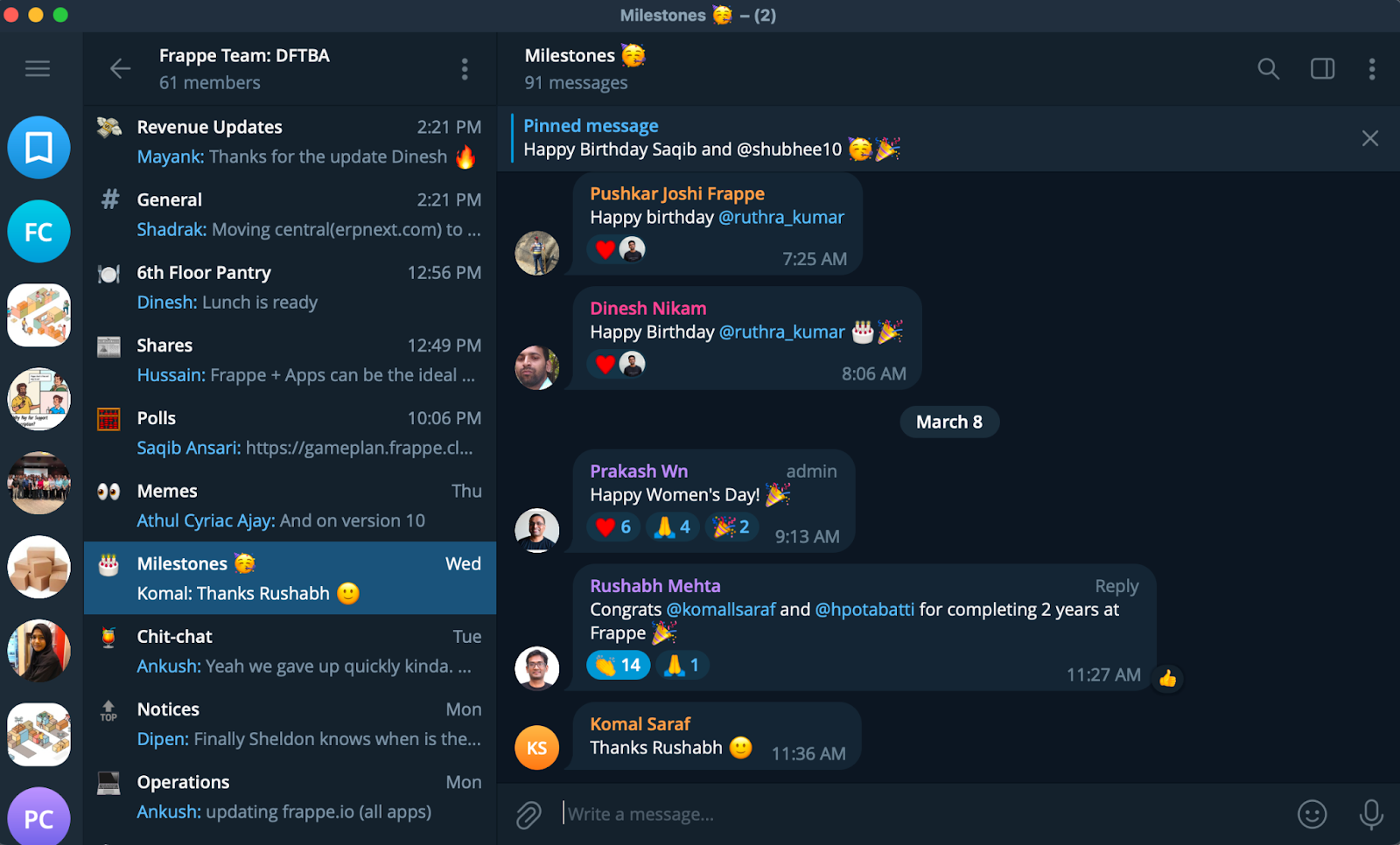 At Frappe, we use Telegram for all the official updates, discussion business ideas, rejoicing collections from the customer’s, and also discussing some serious topics like slow growth rate. These common topics also give a team a sense of belongingness in a bigger group, more than their own deliverables.