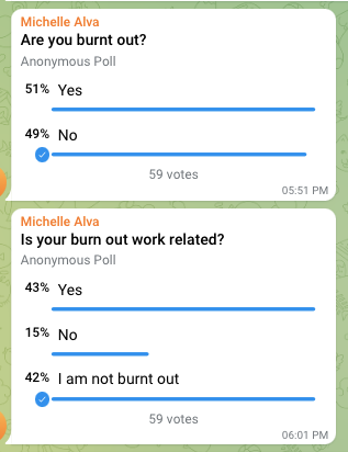 You can get the pulse of mental health via polls. Frappe uses telegram chats for these polls. The company also organised group and individual sessions with the counsellors, so that we can help our teammates recover and deliver better to the team's goal.