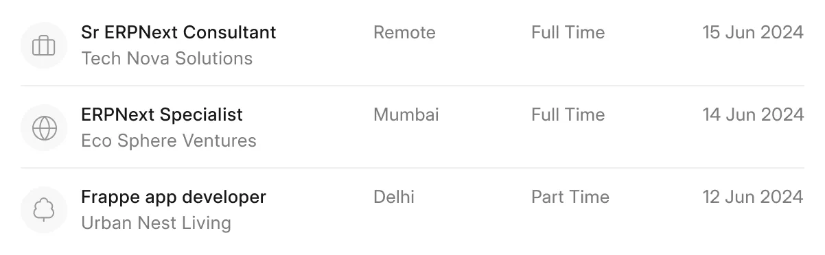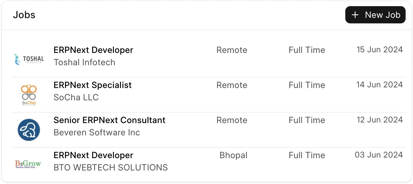 We also provide a job board for our ecosystem. If you are an organization looking for a Frappe Developer or ERPNext Consultant, you can post about the job opening on our board, free of cost. Likewise, if you are an Engineer or Consultant looking for a job opportunity you can apply from this job board.